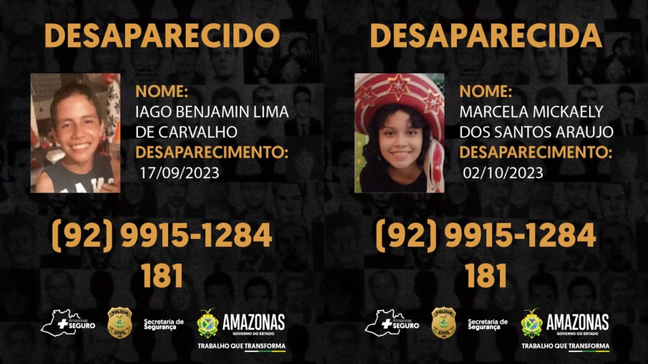 Iago foi visto pela última vez no dia 17 de setembro deste ano, na rua Profª Lea Alencar, bairro Alvorada, zona Centro-Oeste. E Marcela desapareceu na segunda-feira (02/10), na rua Francisco Moreira, bairro Santa Etelvina, zona Norte da capital amazonense.