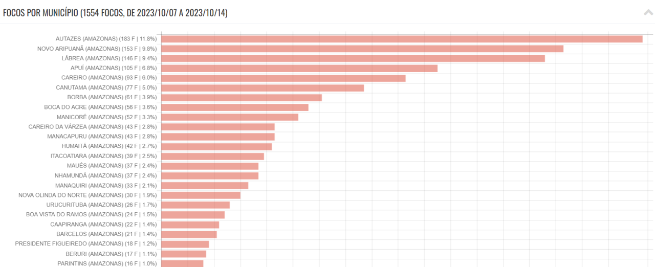 Segundo dados registrados pelo Instituto Nacional de Pesquisas Espaciais (INPE), Autazes aparece em primeiro lugar em números de focos de incêndios no estado do Amazonas, com um total de 183 focos no período de uma semana.