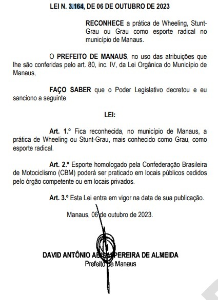 De acordo com a nova lei, o “grau de moto” pode ser praticado em locais públicos cedidos pelo órgão competente ou em locais privados no município de Manaus. A lei entrou em vigor em 6 de outubro deste ano, quando foi publicada no Diário Oficial do Município (DOM).