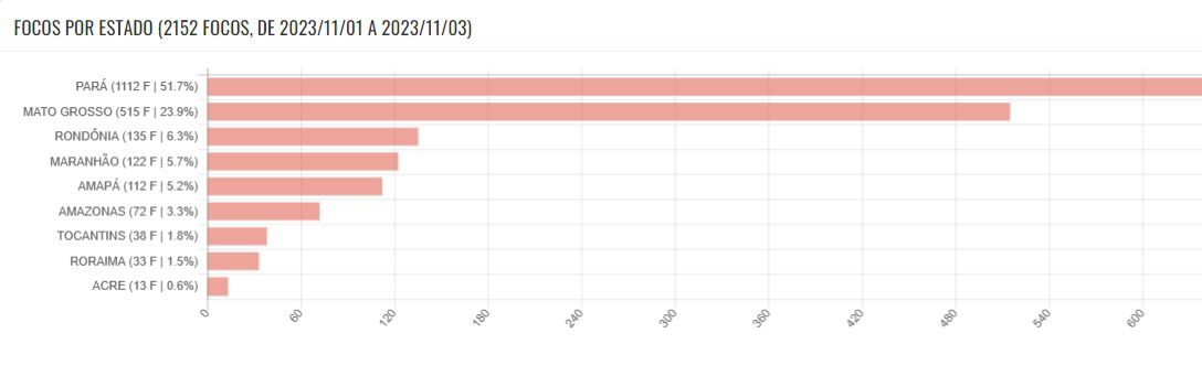De acordo com o Inpe, de 26 de outubro, até ontem (03/11), 5.305 focos foram registrados no estado do Pará e, em menor intensidade, na Região Metropolitana de Manaus (RMM), onde no mesmo período foram registrados 149 focos.