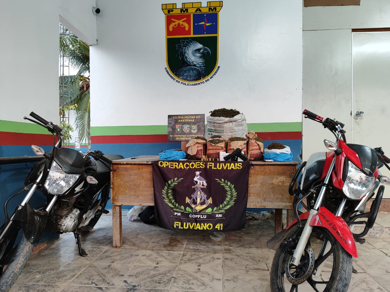 Ao chegarem ao local, os indivíduos fugiram ao avistar a guarnição, deixando para trás uma grande quantidade de maconha, uma pistola calibre .40 com 14 munições intactas, duas balanças de precisão, duas motocicletas Honda (uma Fan preta e uma Titan CG 160 vermelha) e três maços de cigarros.