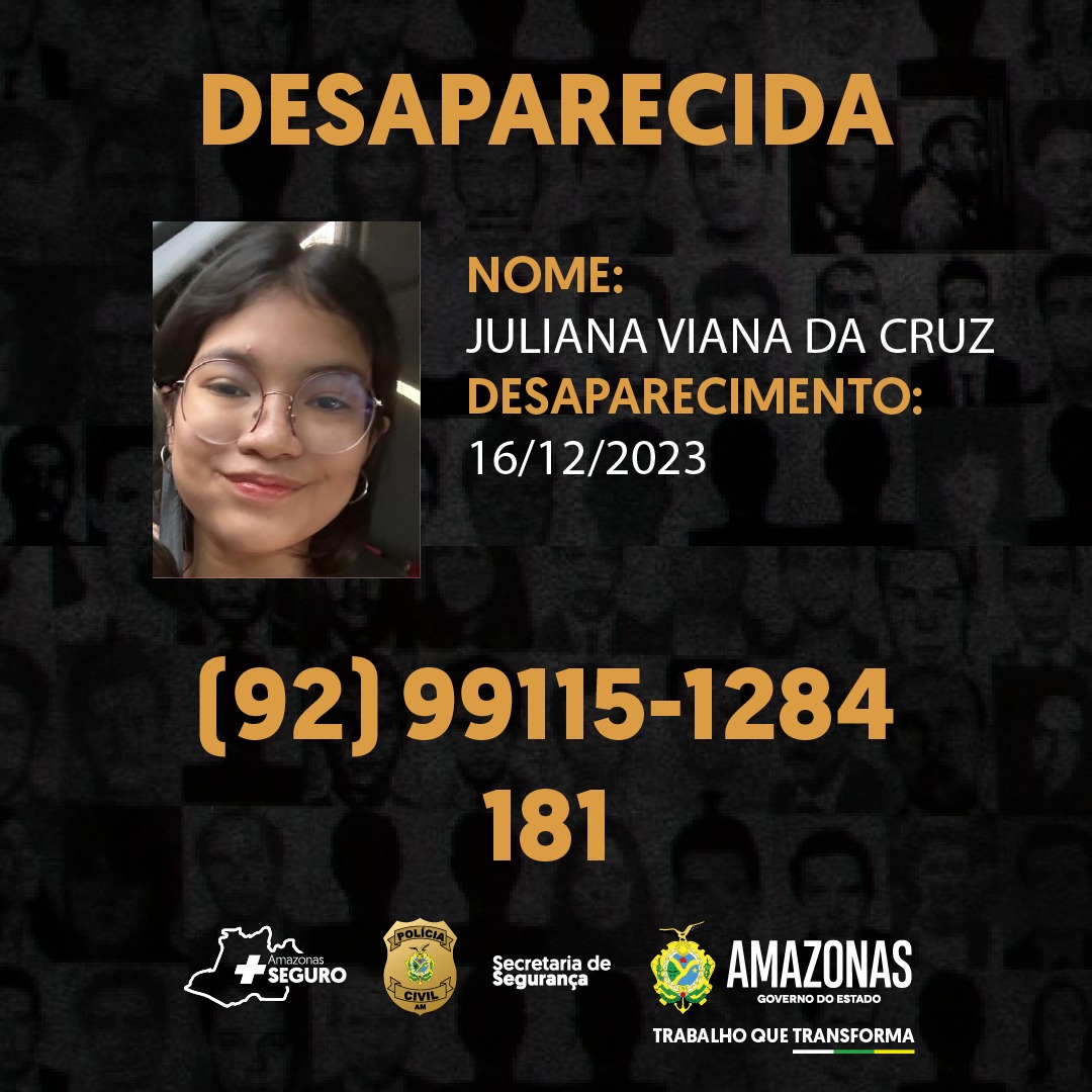 A PC-AM solicita a quem saiba a localização de Juliana Viana, que as informações sejam repassadas por meio dos números (92) 99115-1284, disque-denúncia da Depca, bem como pelo 181, da Secretaria de Estado de Segurança Pública do Amazonas (SSP-AM).