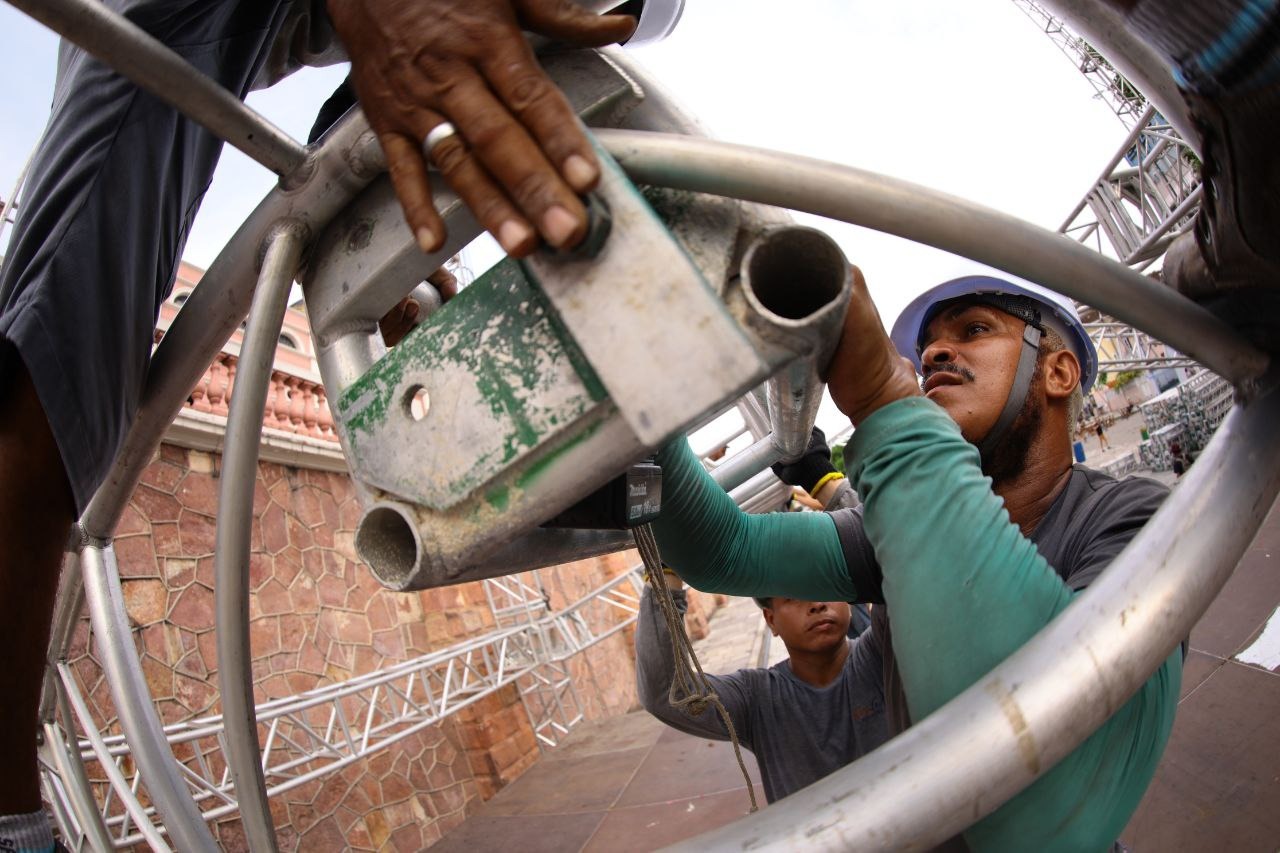 Palco do Réveillon do Largo já está sendo montado ao lado do Teatro Amazonas