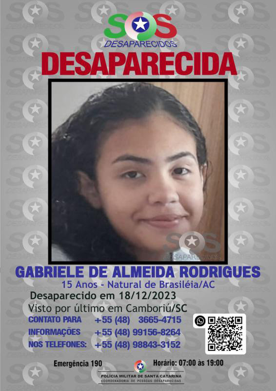 Kely ainda mencionou que seu ex-companheiro já tomou todas as medidas possíveis e que o caso está sendo investigado pela polícia de Santa Catarina. Quem souber de notícias sobre a adolescente Gabriele de Almeida Rodrigues, entre em contato pelos números (68) 992462778 / (93) 991425161.