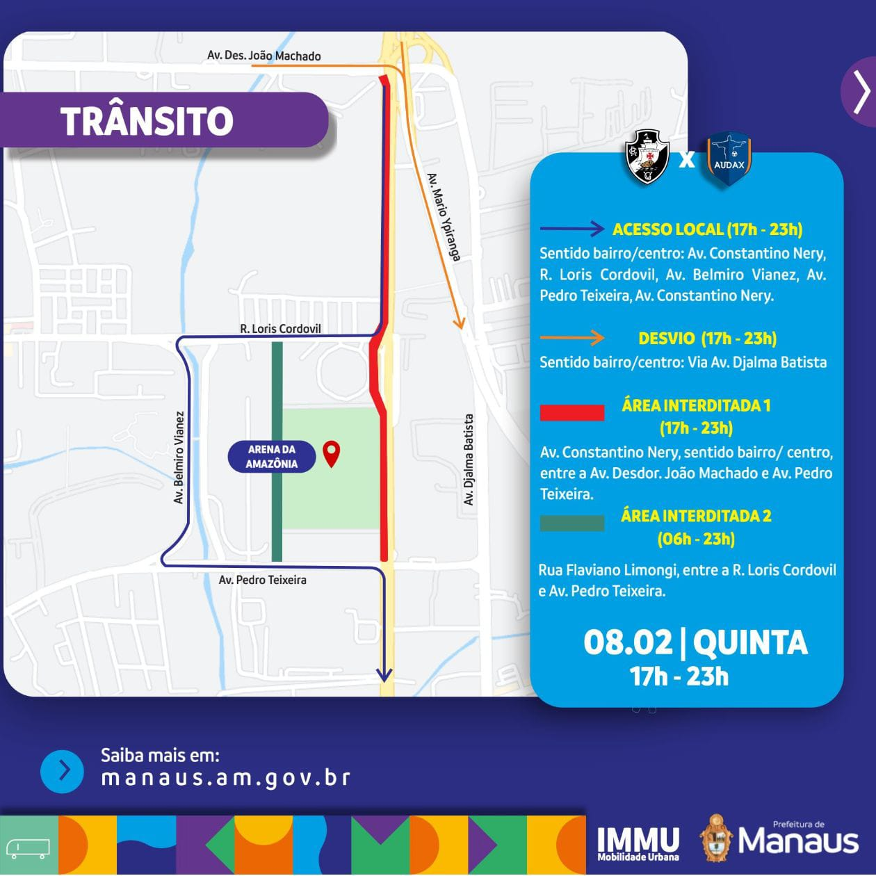 MANAUS-AM | Bola no pé e comodidade aos torcedores serão as palavras de ordem do jogo programado para esta quinta-feira (8), entre os times Vasco da Gama x Audax, pela sétima rodada do Campeonato Carioca, na Arena da Amazônia. O Instituto Municipal de Mobilidade Urbana (IMMU), montou uma operação especial para que os torcedores cheguem com segurança ao local do espetáculo futebolístico. Condutores de veículos devem ficar atentos às mudanças no trânsito e intervenções.