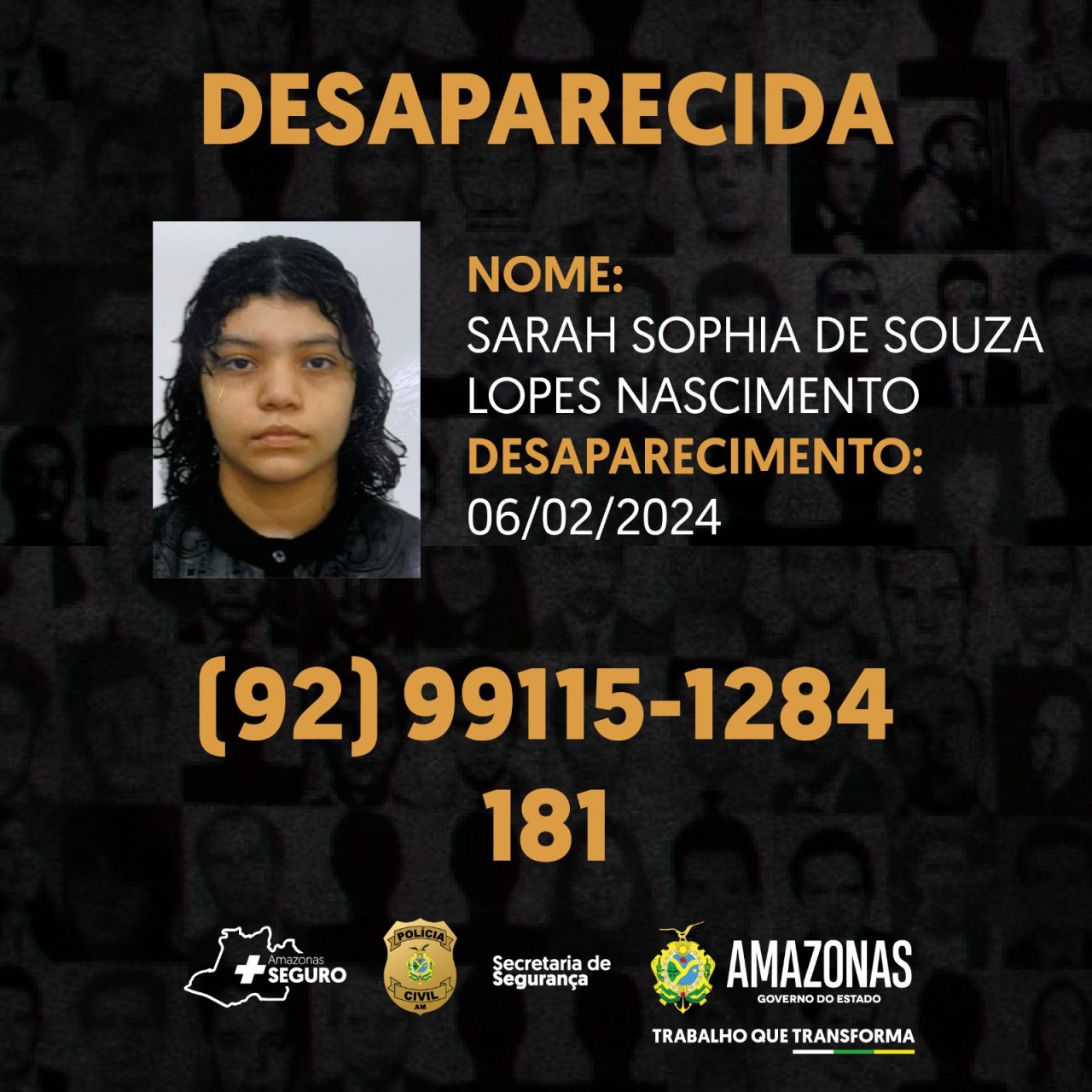 A PC-AM solicita a quem saiba a localização de Sarah Sophia de Souza Lopes Nascimento, que repasse as informações para os números (92) 99115-1284, disque-denúncia da Depca, ou pelo 181 da Secretaria de Estado de Segurança Pública (SSP-AM).