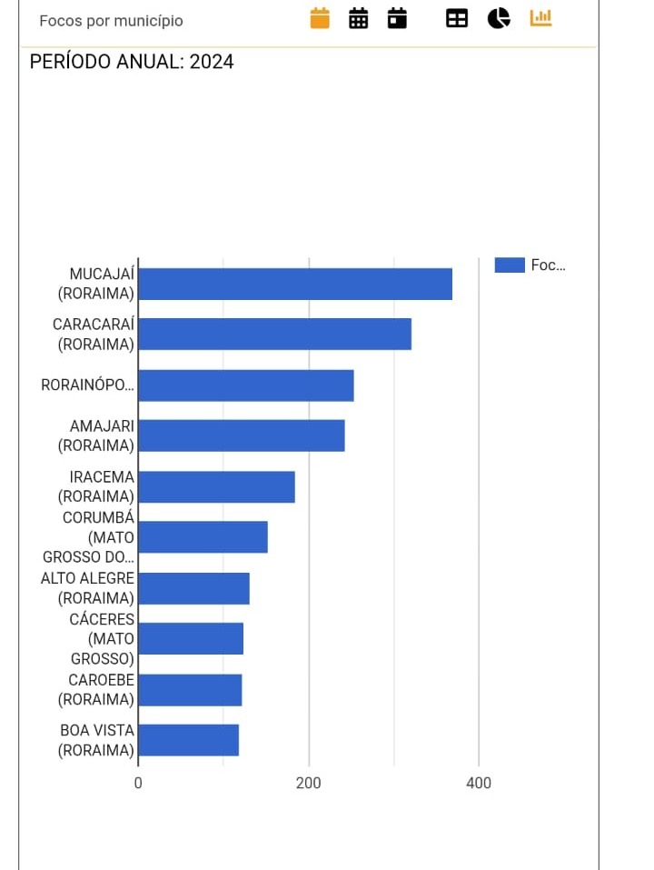 A lista dos dez municípios com maior número de queimadas também é dominada por Roraima, que tem oito representantes. O município de Mucajaí lidera o ranking, com 462 focos, seguido de Caracaraí, com 346, e Rorainópolis, com 336. O gráfico abaixo mostra a distribuição dos focos de incêndio por município em Roraima, segundo os dados do Inpe.