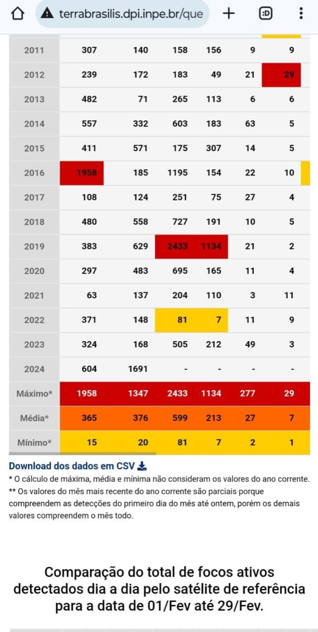 Dentro do Brasil, Roraima é o Estado que ocupa a primeira posição, com 2.295 focos de queimadas, seguido do Mato Grosso, com 1.398, e do Pará, com 842. Os Estados com menos incidência são o Distrito Federal e o Amapá, com apenas quatro registros cada.
