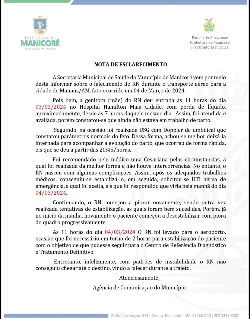 A Secretaria Municipal de Saúde de Manicoré lamenta informar o falecimento de um recém-nascido (RN) durante o transporte aéreo para Manaus em 4 de março de 2024. A mãe deu entrada no Hospital Hamilton Maia Cidade em 3 de março, sendo recomendada uma cesariana devido a complicações no parto. Apesar dos esforços médicos e solicitação de UTI aérea, o RN não resistiu, falecendo durante o trajeto. O município está em luto diante dessa triste situação.