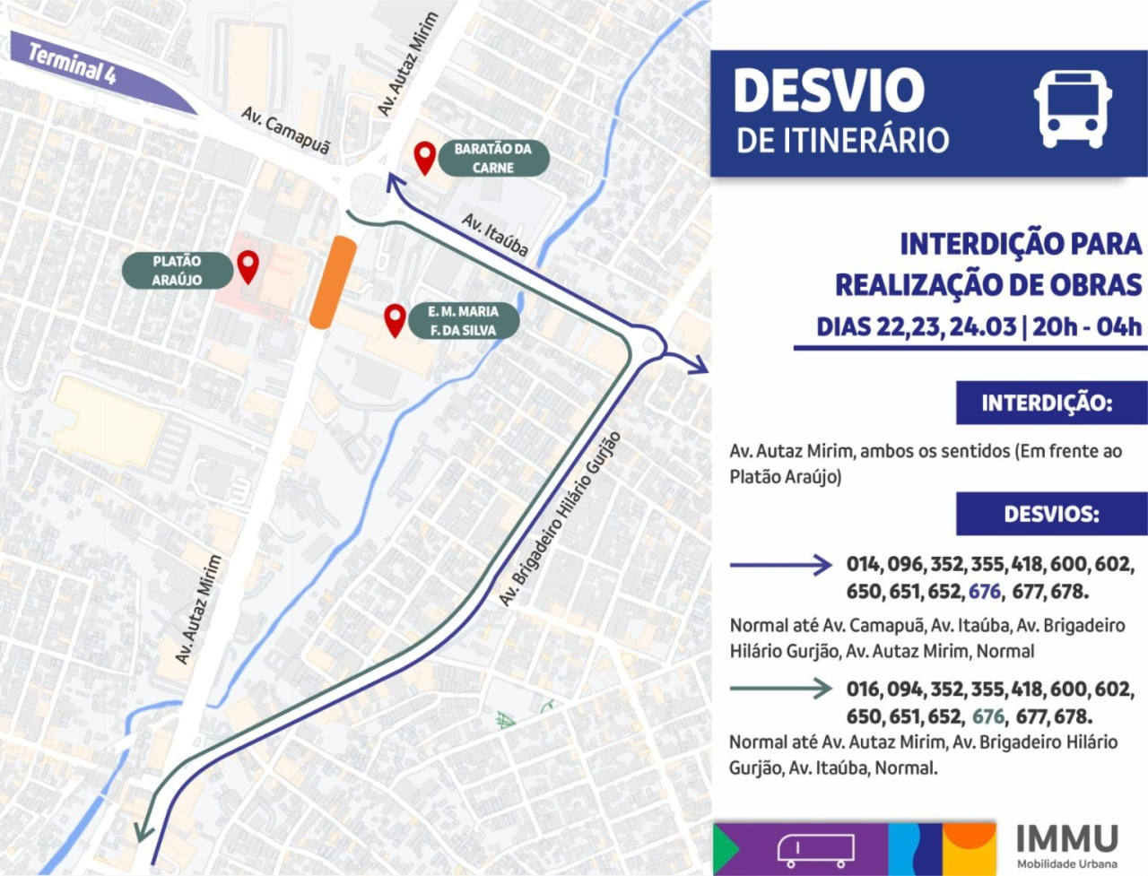 Por sua vez as linhas 016, 094, 352, 355, 418, 600, 602, 650, 651, 652, 676, 677 e 678 que seguem pela avenida Autaz Mirim em direção ao T4, seguirão pelas avenidas Autaz Mirim, Brigadeiro Hilário Gurjão, Itaúba e, depois, seguem seus itinerários normais.