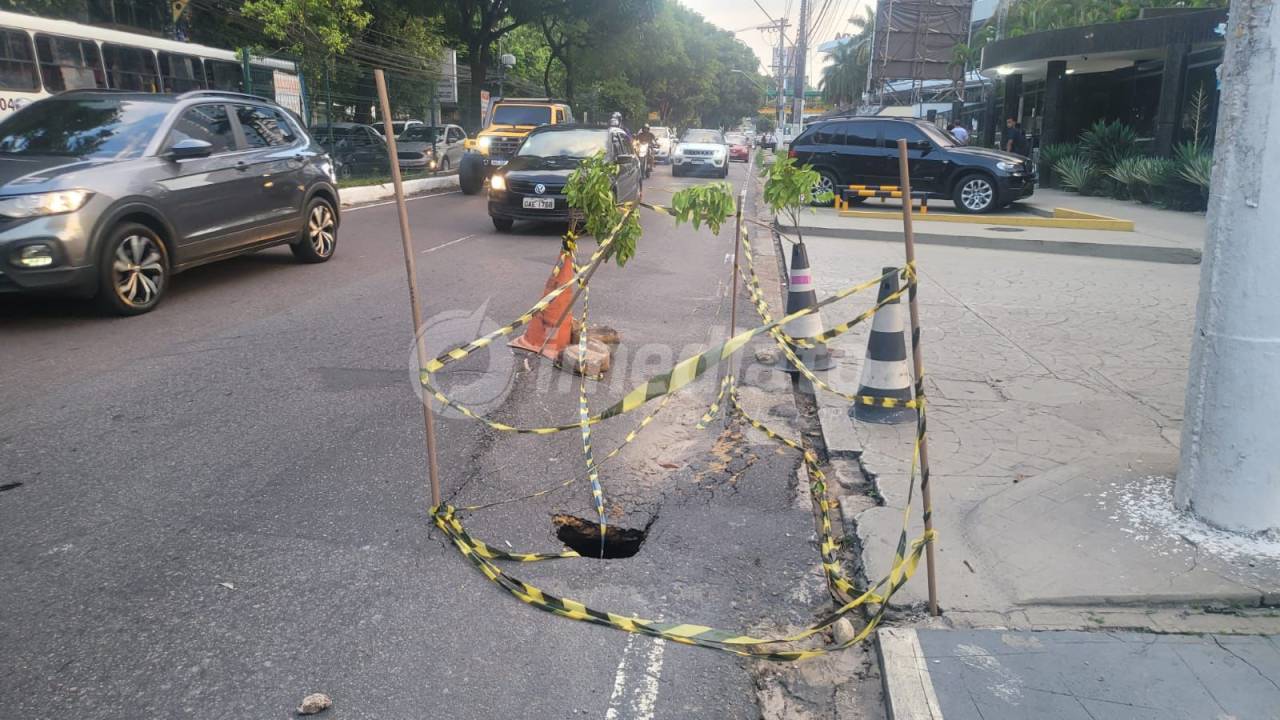 Buraco na Avenida Umberto Calderaro em Manaus causa transtornos e preocupação para moradores e motoristas da região.