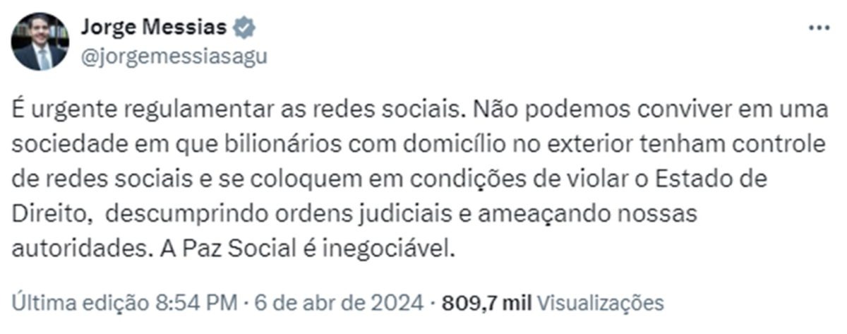 PAÍS | O ministro da Advocacia-Geral da União (AGU), Jorge Messias, fez uma declaração enfática sobre a necessidade urgente de regulamentação das redes sociais no Brasil. Em uma publicação no antigo Twitter, Messias argumentou que “bilionários com domicílio no exterior” não podem controlar as redes sociais e violar o Estado de Direito.