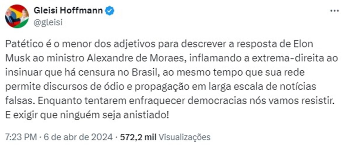 A presidente do PT, deputada Gleisi Hoffmann (RS), criticou a postura do empresário, classificando-a como “patética” e afirmando que inflama a extrema direita ao insinuar que há censura no Brasil.