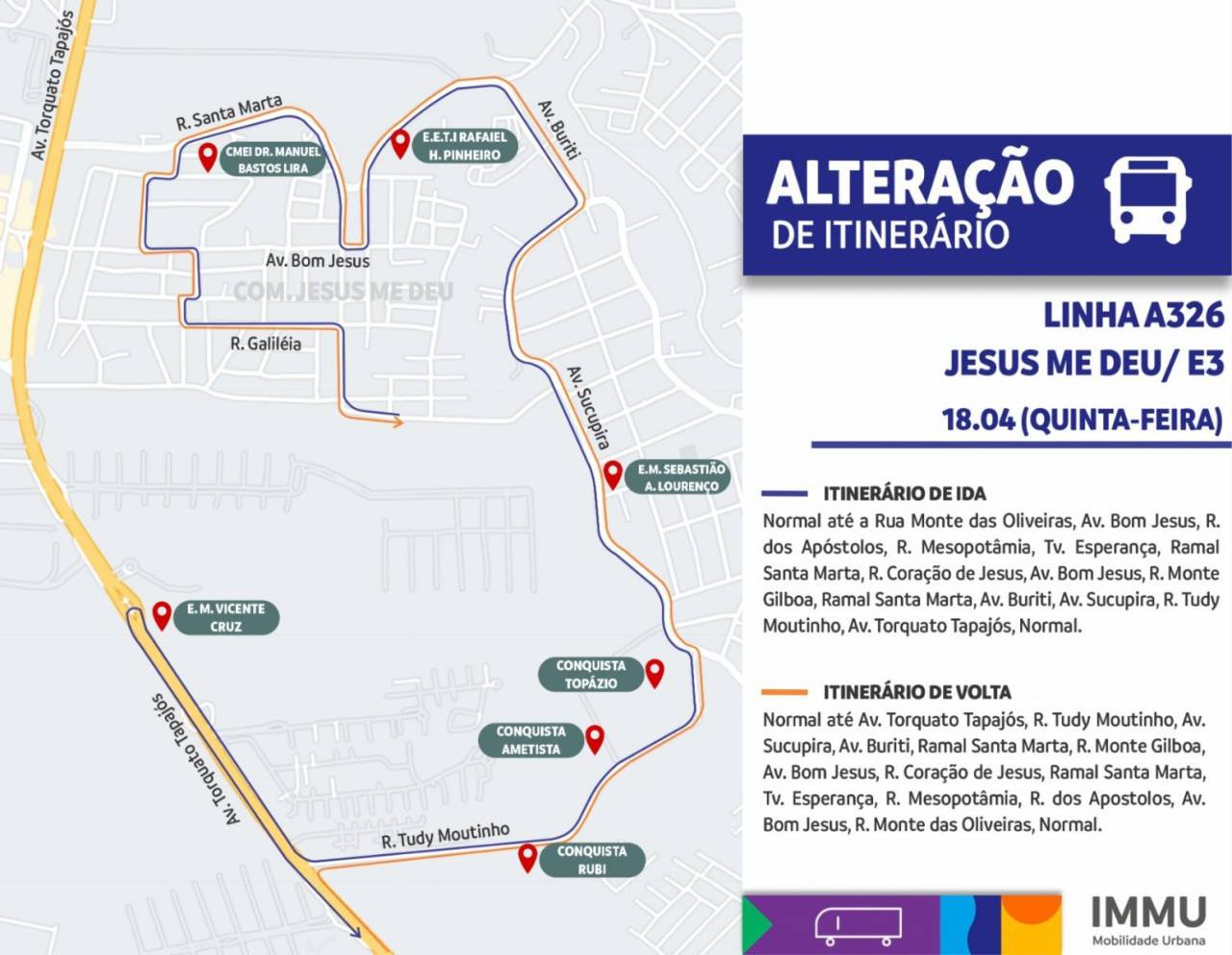 Manaus-Am| O Instituto Municipal de Mobilidade Urbana (IMMU) anunciou uma mudança no itinerário da linha A326 – Jesus me Deu/Estação de Transferência 3 (E3) com o objetivo de aprimorar os serviços de transporte público na região.