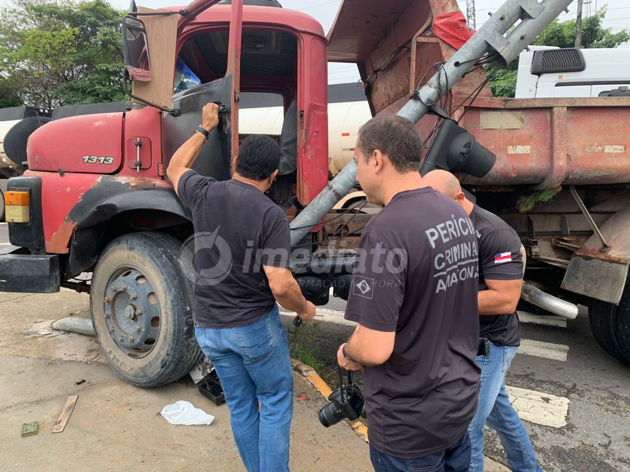 Caminhão perde controle e atropela motorista e pedestre em avenida movimentada em Manaus.