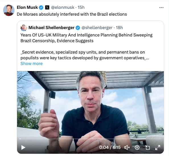 Musk diz em tuíte que Moraes interferiu nas eleições do Brasil