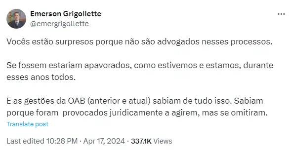 O jurista Emerson Grigollette comentou sobre a ação: “Vocês estão surpresos porque não são advogados nesses processos; se fossem, estariam apavorados, como estivemos e estamos durante esses anos todos”.