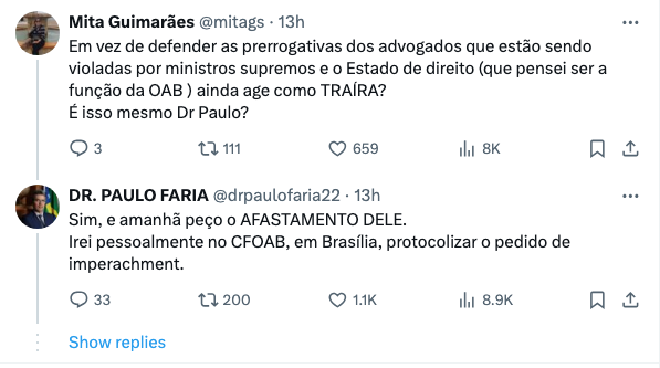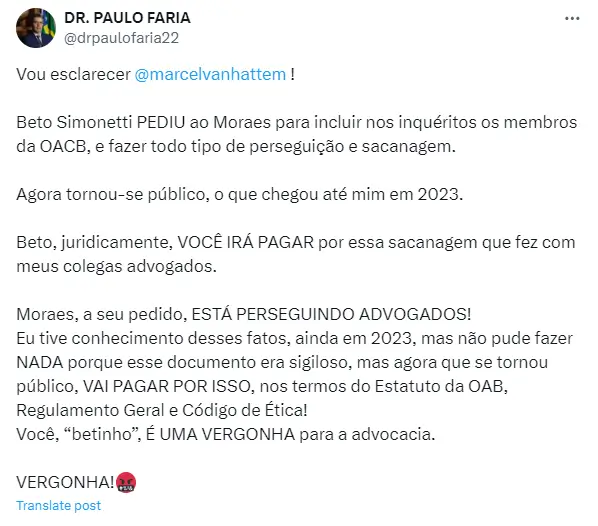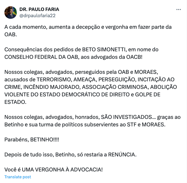 Em outro post na rede X, o advogado Paulo Faria destila sua ira contra Beto Simonetti e ainda comenta que irá protocolar um pedido de impeachment contra o Presidente do Conselho Federal.