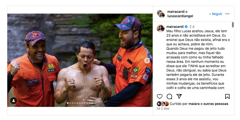 A influenciadora digital e empresária Maíra Cardi compartilhou nas redes sociais momentos emocionantes do batismo de seu filho, Lucas Cardi, de 23 anos. Em um relato pessoal, Maíra expôs a jornada espiritual de Lucas, destacando que anteriormente ele não acreditava em Deus, uma descrença que ela mesma havia ensinado.