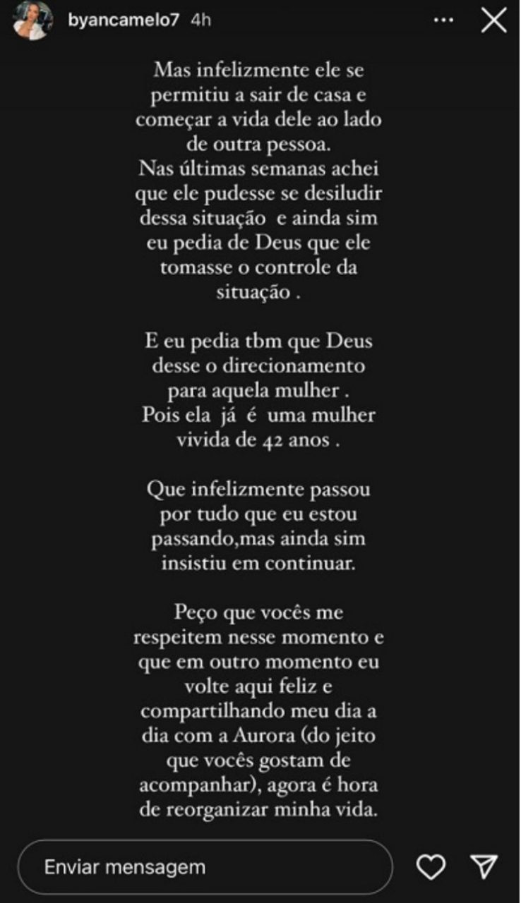 A modelo relatou para os fãs a situação do casal e pediu respeito aos seguidores e contou que precisa reorganizar sua vida agora.
