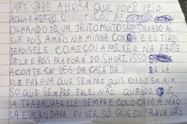 Em uma parte da carta, a menina escreveu: ”Ele colocou a mão dentro da minha coxa, e eu tirei. Depois, ele começou a mexer na parte dele e pôs para fora do short”.