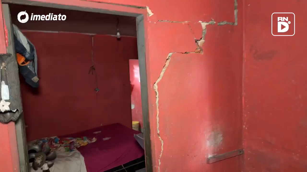 Dentro da casa, é possível observar várias rachaduras e uma depressão no piso na área da cozinha. “Afundou ali na cozinha, as paredes estão rachando, no quarto a parede já está rachada no meio. Eu não estou aqui porque quero, é porque não tenho para onde ir. Estou fazendo um apelo às autoridades: só vão procurar a gente quando a casa desabar?”, disse Cristiane.