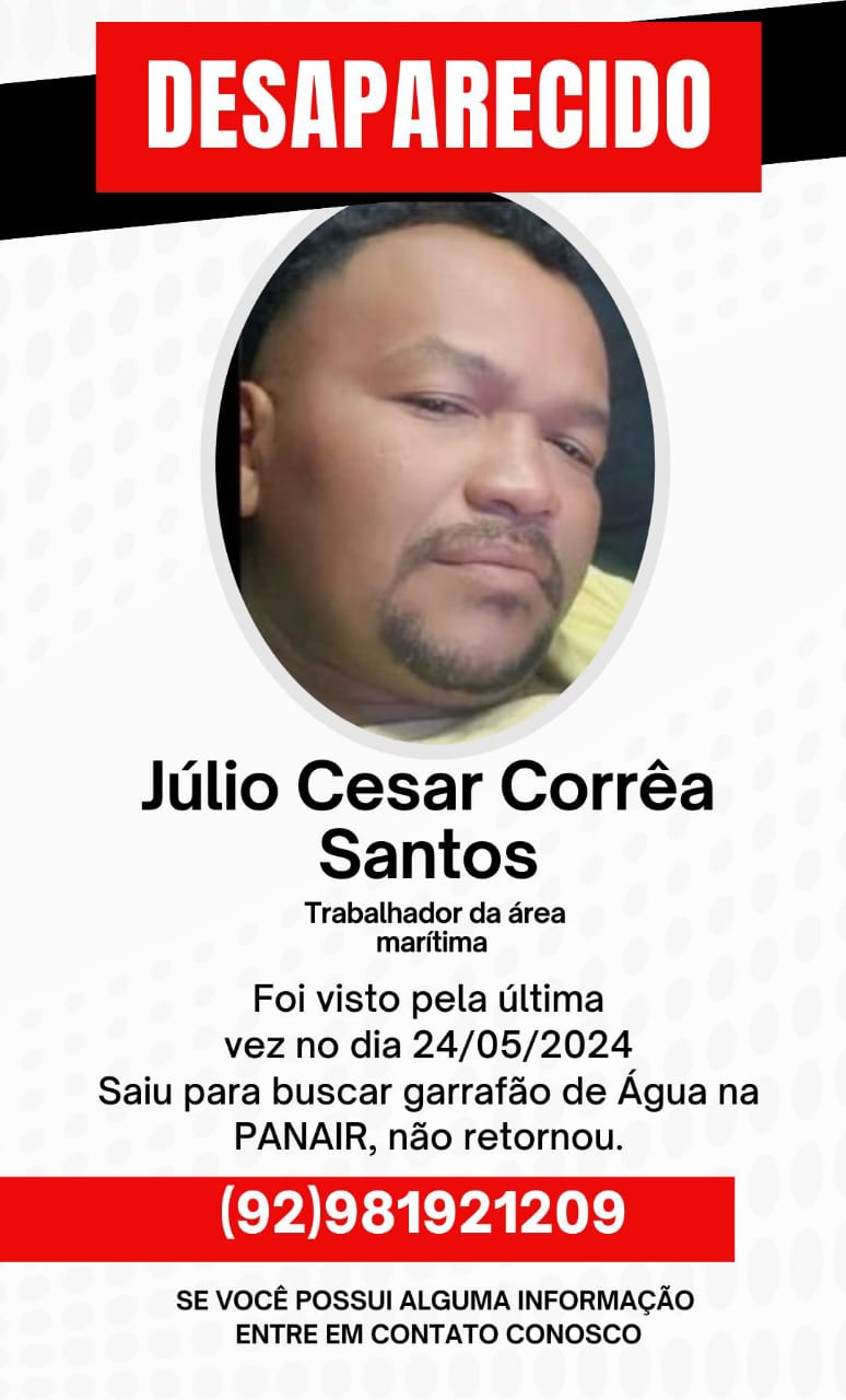 Um homem identificado como Júlio César Corrêa Santos, de idade não divulgada, saiu de casa na última sexta-feira (24) em direção à Feira da Panair, no Educandos, para buscar um garrafão de água e acabou não retornando. Júlio, segundo informações repassadas pelos familiares, é trabalhador da área marítima e não tinha o costume de sair sem retornar.