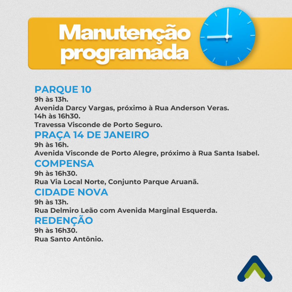 Amazonas Energia planeja semanalmente, desligamentos programados no fornecimento de energia elétrica em pequenos pontos do nosso Estado, sempre seguindo a legislação em vigência, informando todos os seus clientes com no mínimo 72h de antecedência do serviço.