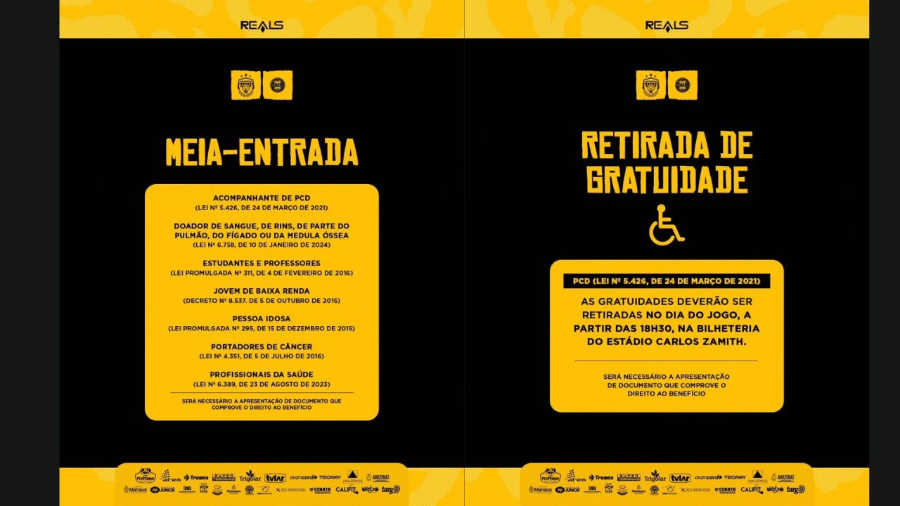 A venda presencial será realizada apenas no dia do jogo, a partir das 18h30, na bilheteria do estádio, assim como a retirada de gratuidades, mediante apresentação da documentação necessária. A entrada de crianças com menos de 5 anos não é permitida, conforme a portaria conjunta nº 001/2024-GS/SSP.