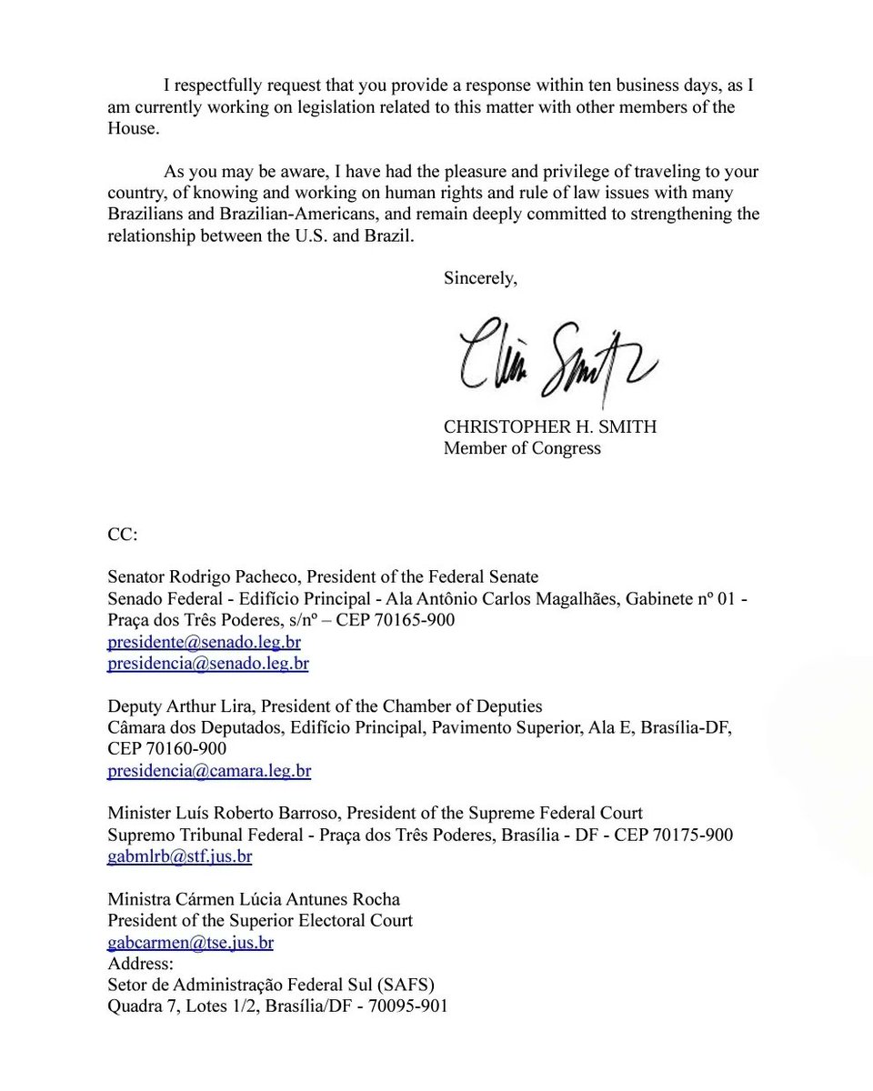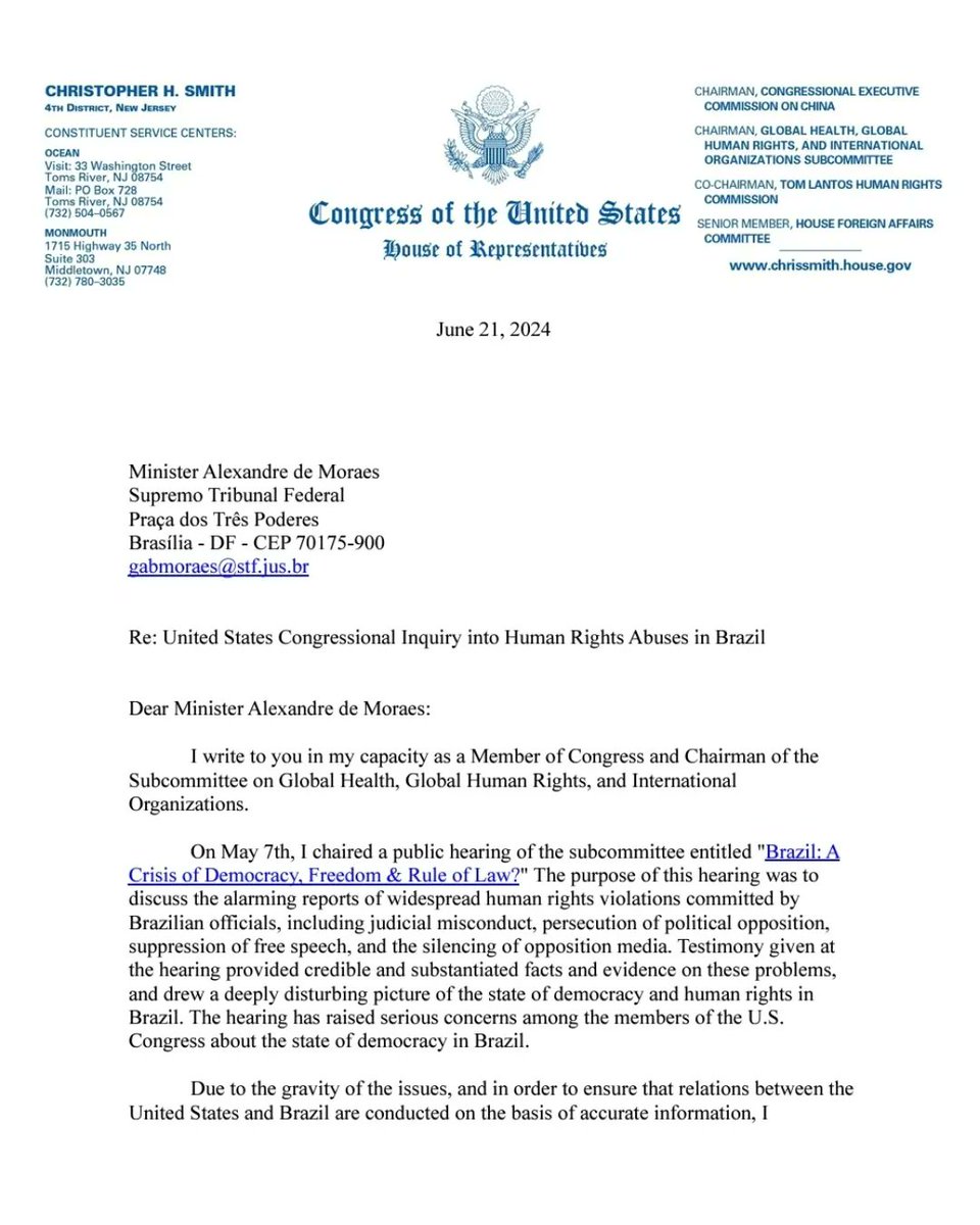 O deputado norte-americano Chris Smith enviou uma carta ao ministro Alexandre de Moraes, do Supremo Tribunal Federal (STF), expressando preocupações sobre relatos de perseguição política, falta de liberdade de expressão e possíveis irregularidades judiciais no Brasil. Smith estipulou um prazo de dez dias para que o magistrado responda às questões levantadas.