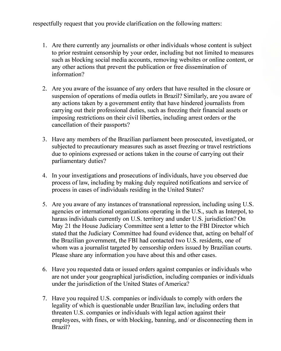 — Você solicitou dados ou emitiu ordens contra empresas ou indivíduos que não estão sob sua jurisdição geográfica? Você tem conhecimento da emissão de quaisquer ordens que resultaram no fechamento ou na suspensão das operações de veículos de comunicação no Brasil? Em suas investigações e processos, você observou o devido processo legal, incluindo a notificação e a citação devidamente exigidas nos casos de indivíduos residentes nos Estados Unidos?