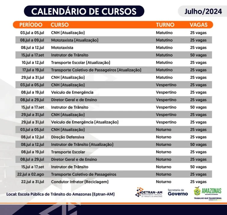 O Departamento Estadual de Trânsito do Amazonas (Detran-AM) está oferecendo uma variedade de cursos gratuitos através da Escola Pública de Trânsito (Eptran) durante o mês de julho. Aqui estão os cursos disponíveis: