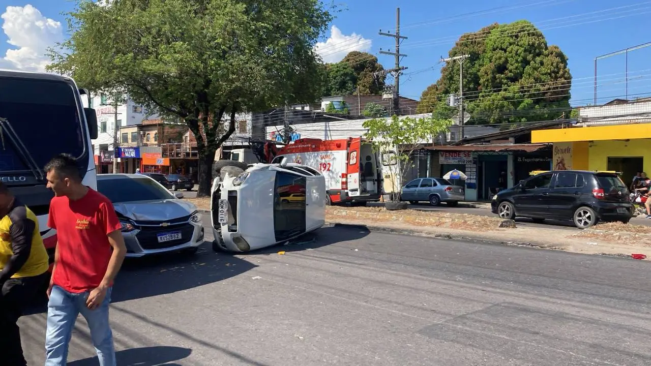 Na tarde desta quinta-feira (4), um veículo branco modelo sedan, de placa não identificada, acabou capotando após colidir com outro veículo na Av. Autaz Mirim, bairro Tancredo Neves, zona Leste de Manaus.