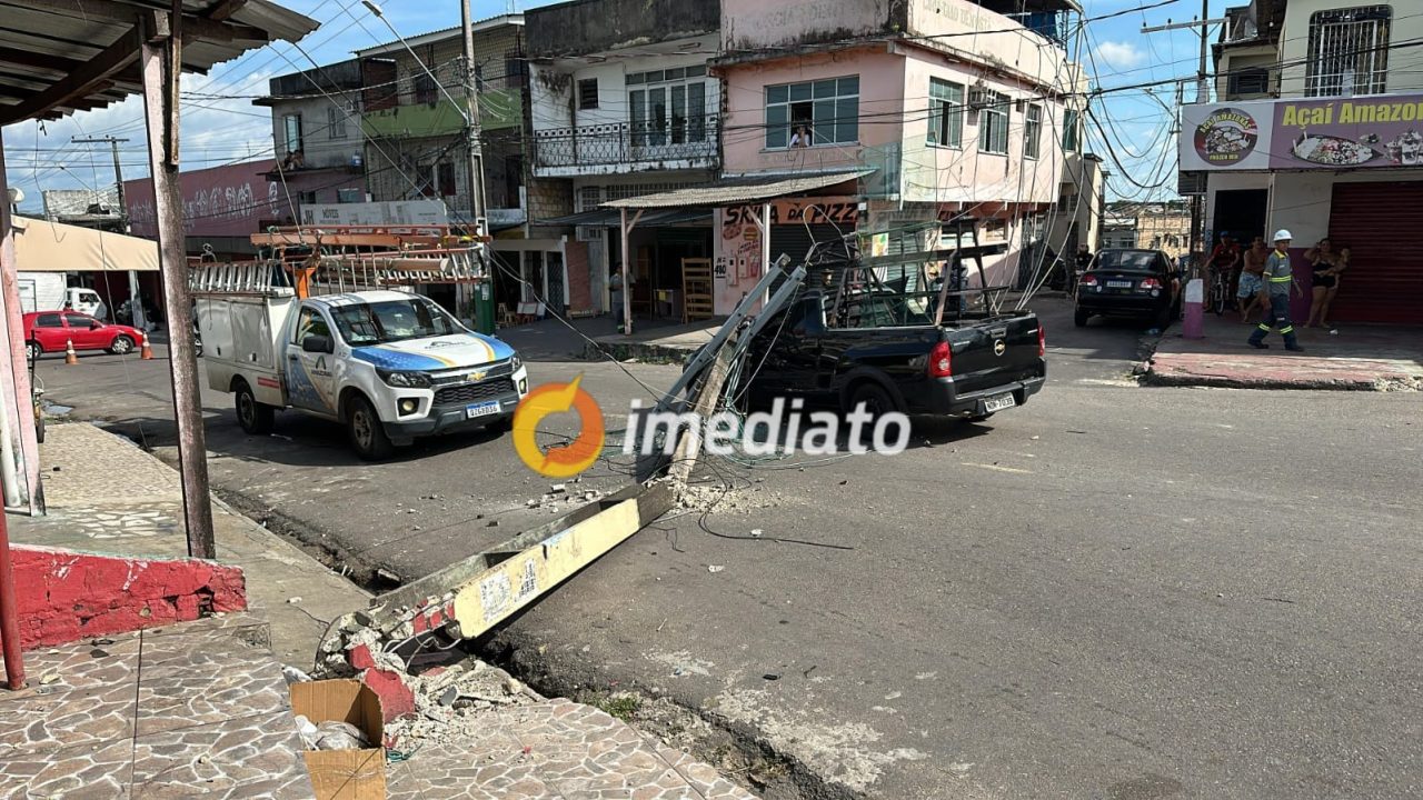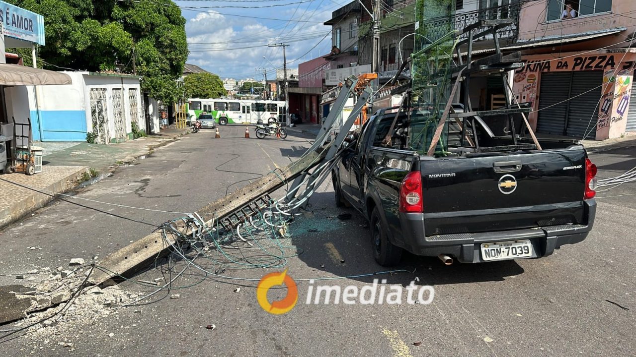 Carreta derruba fio elétrico e poste cai sobre carro na Compensa, em Manaus.