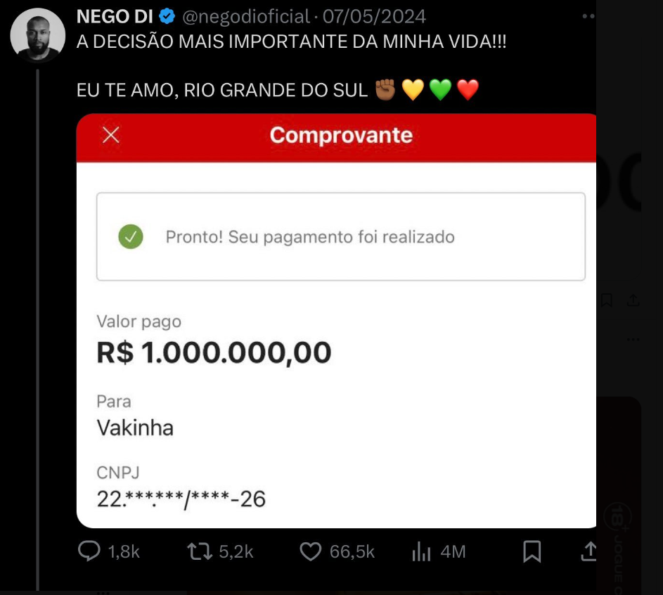 Durante o período da tragédia, Nego Di também exortou outras celebridades a se posicionarem e contribuírem com doações para ajudar o Rio Grande do Sul, aumentando ainda mais a repercussão de suas alegações falsas.