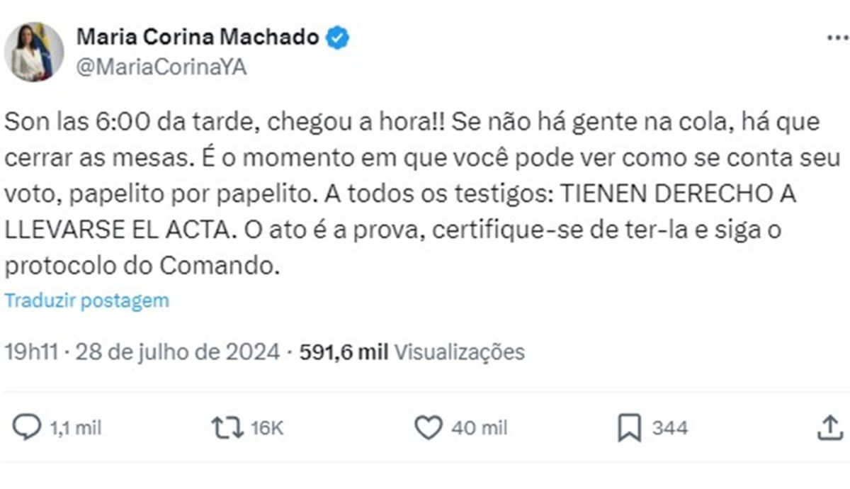 “É hora de você ver como seu voto é contado, voto por voto”, escreveu María em sua conta no X. Ela seria candidata pela coalizão Plataforma Unitária Democrática (PUD), mas teve sua inscrição barrada. O candidato da oposição, líder nas pesquisas eleitorais, é o ex-diplomata Edmundo González.