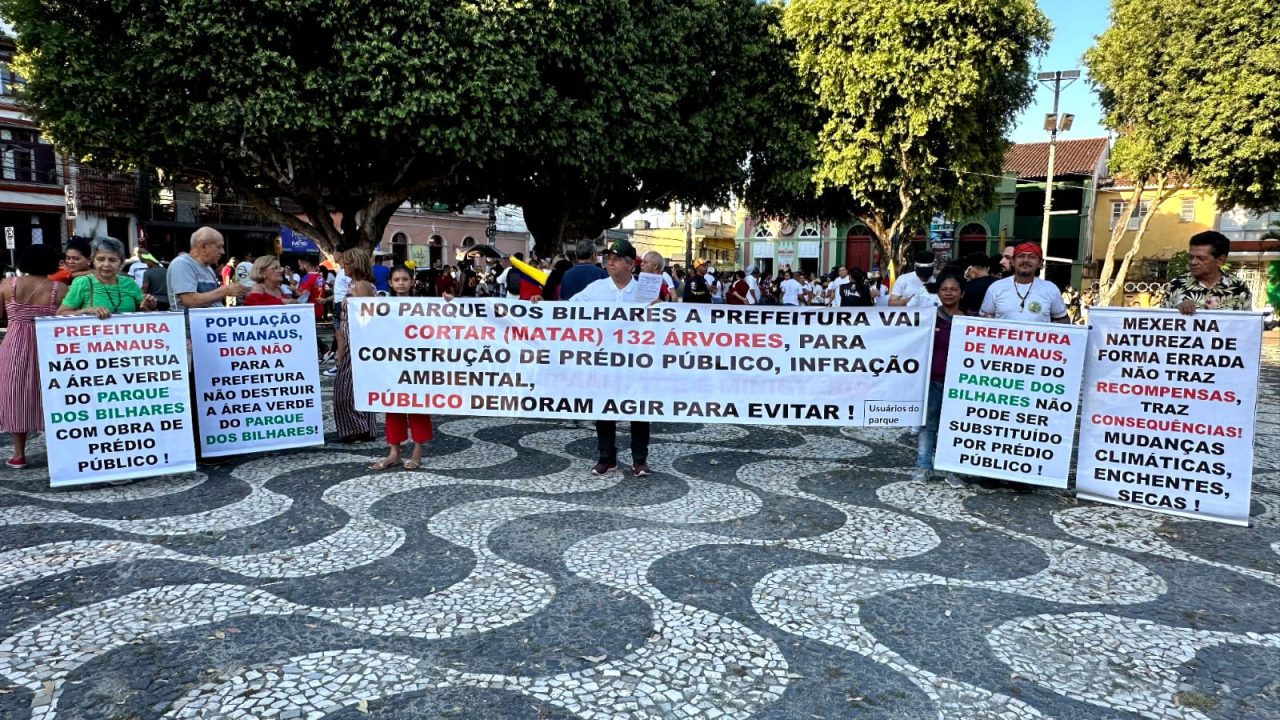 Na tarde deste domingo (28), a população se reuniu no Largo São Sebastião para um ato de protesto contra a obra da Prefeitura de Manaus no Parque dos Bilhares. O plano prevê a construção de um prédio público para a Secretaria Municipal de Meio Ambiente e Sustentabilidade (Semmas Clima), que resultará na remoção de várias árvores e redução do espaço verde.