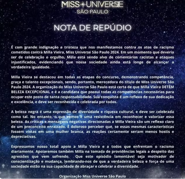 A recém-eleita Miss Universe São Paulo, Milla Vieira, tem enfrentado uma onda de ataques racistas nas redes sociais desde que foi anunciada vencedora do concurso, realizado na última quarta-feira (24). Representante de São Bernardo do Campo, Milla Vieira, que é uma mulher negra, irá representar o estado no concurso nacional que ocorrerá em setembro deste ano.