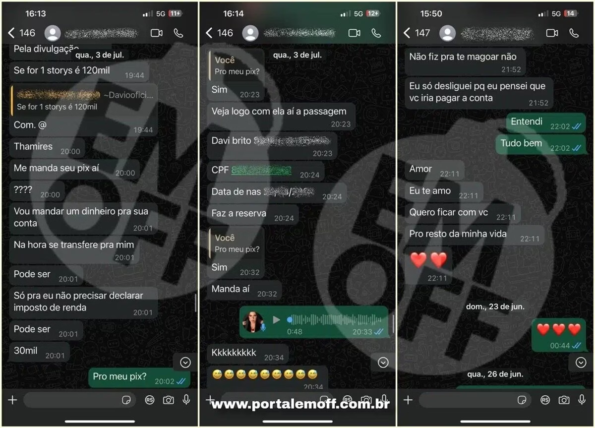Na conversa, que teria ocorrido no dia 15 de junho, Davi Brito ainda se declarou: “Tá ocupada? Tô com saudades. Não falou comigo hoje, tá de mal é?”, questionou ele.