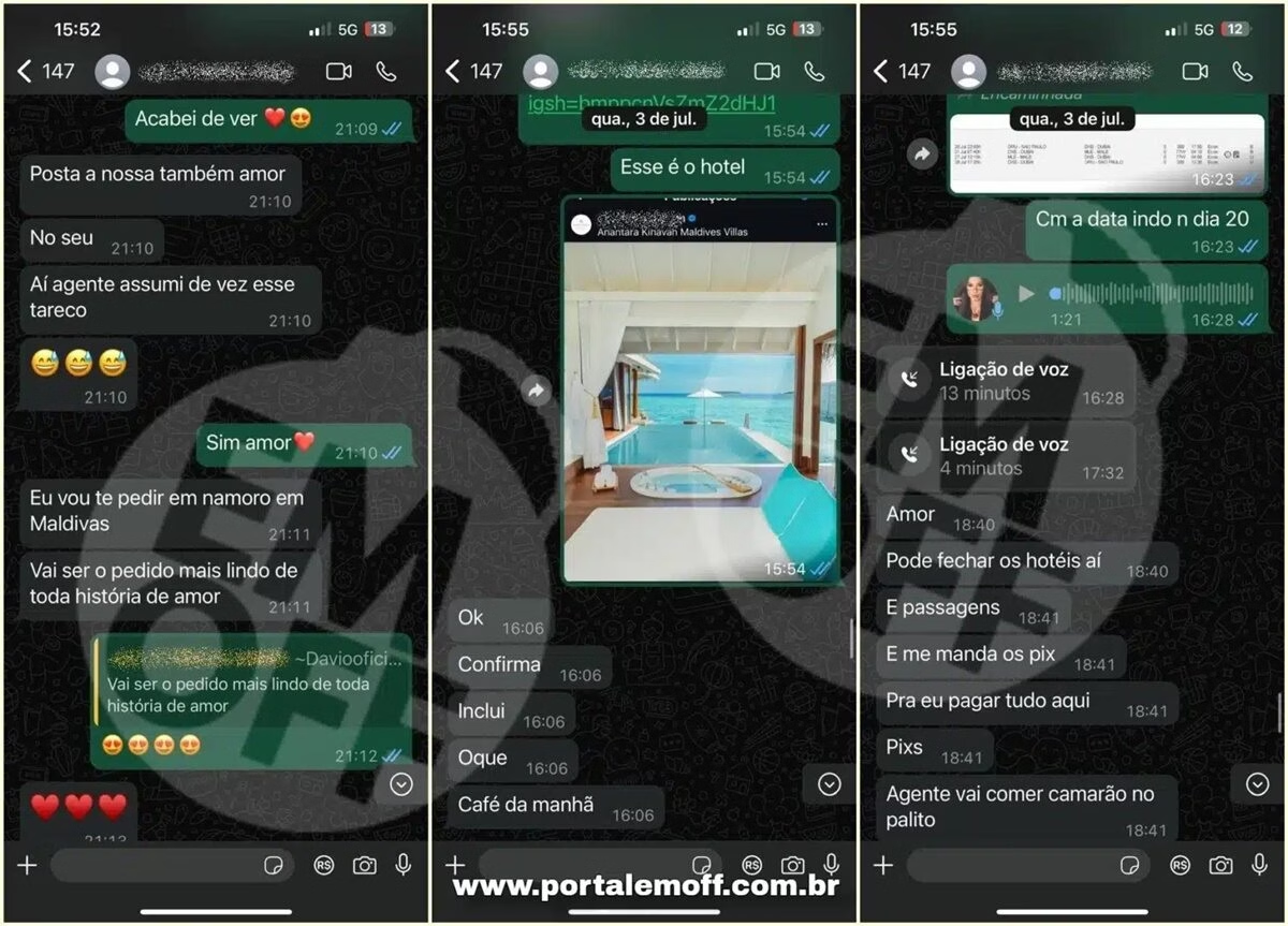 “Posta a nossa [foto] também, amor. Aí, a gente assume de vez esse tareco (sic). Eu vou te pedir em namoro em Maldivas. Vai ser o pedido mais lindo de toda história de amor”, garantiu ele.