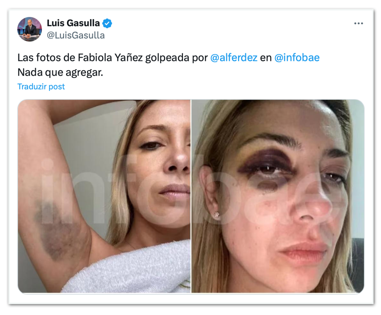 Ainda segundo o Infobae, Yañez enviava as fotos a Fernández reclamando das atitudes violentas. “E quando você me sacudiu pelos braços, me deixou hematomas. Isso é quando você me sacudiu.” Após ter enviado uma foto com o olho roxo, a mulher ironizou Fernández. “Isso foi quando você me bateu sem querer.”