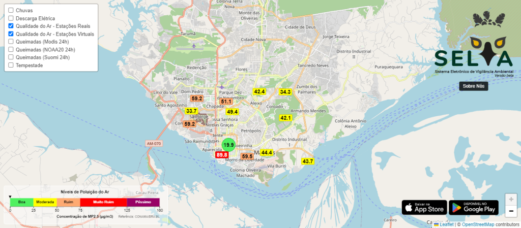 O sistema “Selva”, criado pela Universidade do Estado do Amazonas (UEA), indicou que bairros das zonas Sul e Oeste foram os mais impactados. No bairro Morro da Liberdade, por exemplo, o índice de poluição do ar, que varia entre 75 e 125 para ser considerado muito ruim, atingiu 89,9. Em Aparecida, outro bairro da Zona Sul, o nível chegou a 82,3, enquanto no Compensa, o índice alcançou 83,2 em determinados períodos da manhã.