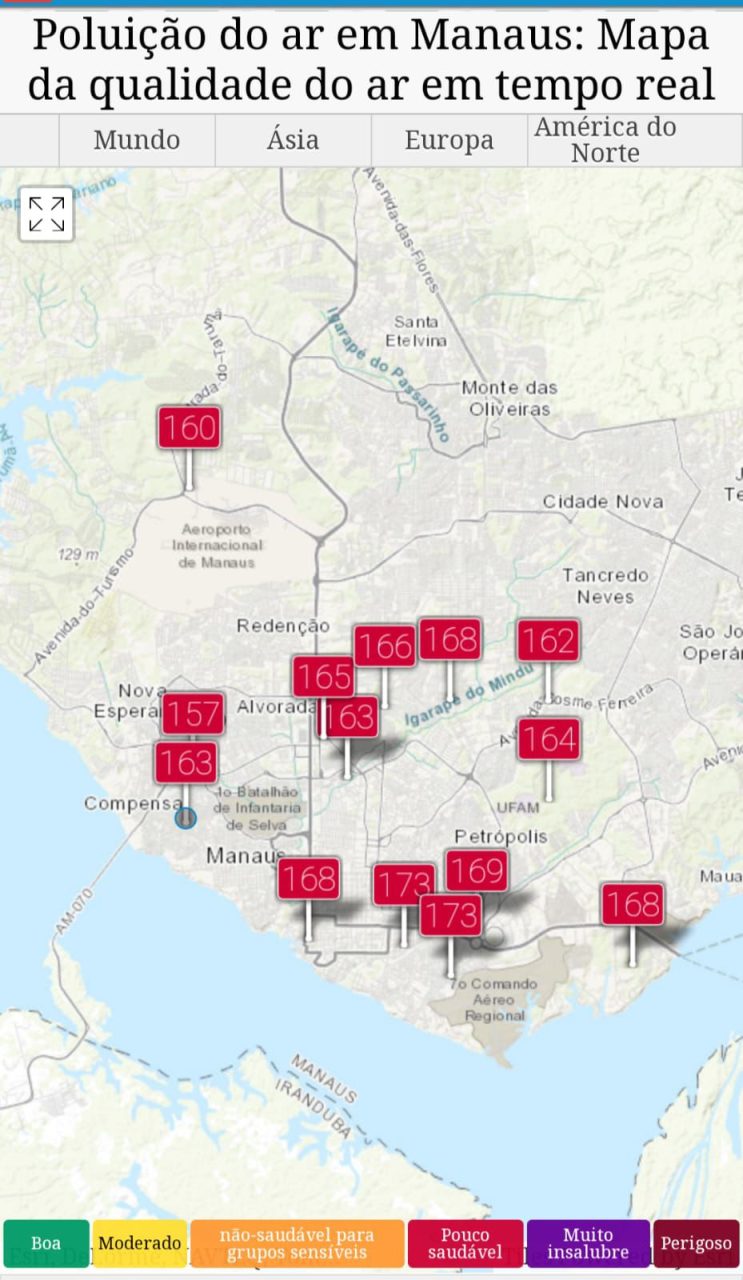 MANAUS-AM | Manaus amanheceu, pelo quinto dia consecutivo, com a qualidade do ar muito ruim nesta quarta-feira (14/08), devido às queimadas ilegais em várias áreas do Amazonas. De acordo com o Sistema Eletrônico de Vigilância Ambiental (AppSelva), da Universidade do Estado do Amazonas (UEA), que fornece dados em tempo real sobre poluição do ar na Amazônia, no Brasil e em países da América do Sul, a situação é crítica.