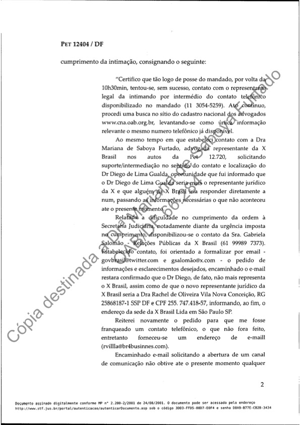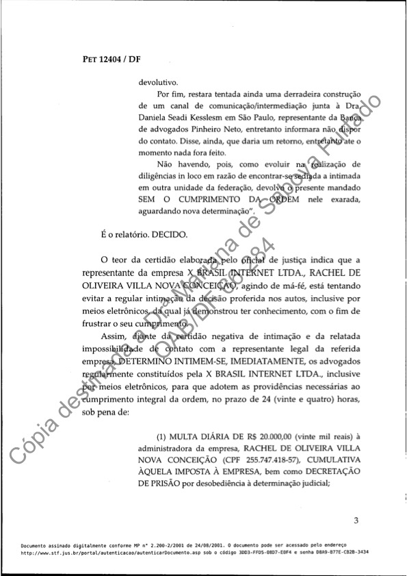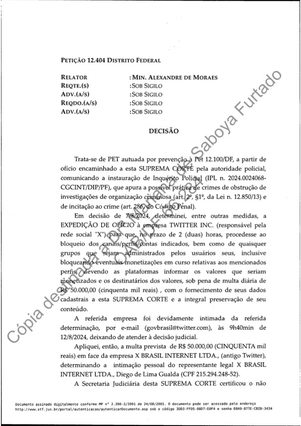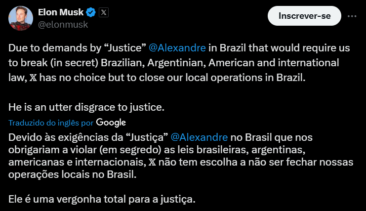 Noite passada, Alexandre de Moraes ameaçou nosso representante legal no Brasil com prisão se não cumprirmos suas ordens de censura. Ele fez isso em uma ordem secreta, que compartilhamos aqui para expor suas ações. Apesar de nossos inúmeros recursos ao Supremo Tribunal Federal não terem sido ouvidos, de o público brasileiro não ter sido informado sobre essas ordens e de nossa equipe brasileira não ter responsabilidade ou controle sobre o bloqueio de conteúdo em nossa plataforma, Moraes optou por ameaçar nossa equipe no Brasil em vez de respeitar a lei ou o devido processo legal. Como resultado, para proteger a segurança de nossa equipe, tomamos a decisão de encerrar nossas operações no Brasil, com efeito imediato. O serviço X continua disponível para a população do Brasil. Estamos profundamente tristes por termos sido forçados a tomar essa decisão. A responsabilidade é exclusivamente de Alexandre de Moraes. Suas ações são incompatíveis com um governo democrático. O povo brasileiro tem uma escolha a fazer – democracia ou Alexandre de Moraes.