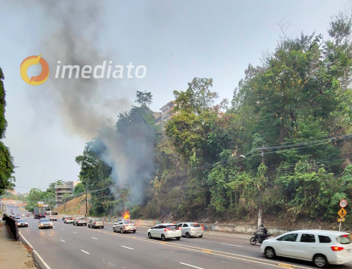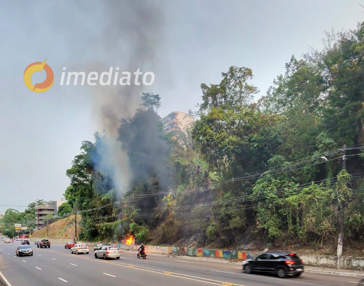 Fogo atinge vegetação às margens da Avenida Mario Ypiranga em Manaus, e Corpo de Bombeiros trabalha para controlar as chamas.