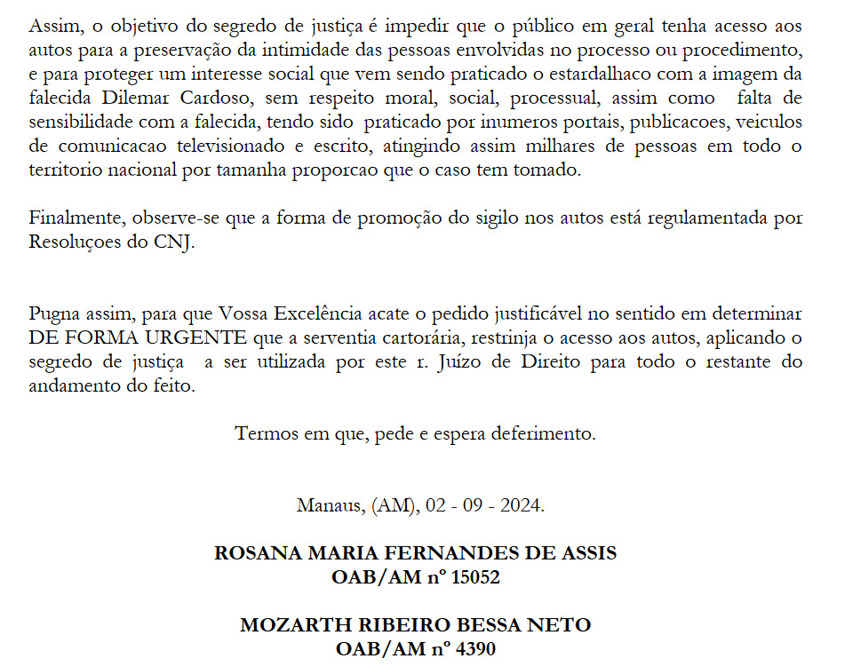 Diante do crescente sensacionalismo e do impacto negativo sobre a privacidade da falecida, Mozart Bessa entrou com um pedido ao CNJ para que o segredo de justiça seja novamente aplicado ao processo. O advogado argumenta que a divulgação pública tem gerado um estardalhaço desrespeitoso e sensacionalista, desconsiderando a sensibilidade do caso e prejudicando a imagem da falecida.