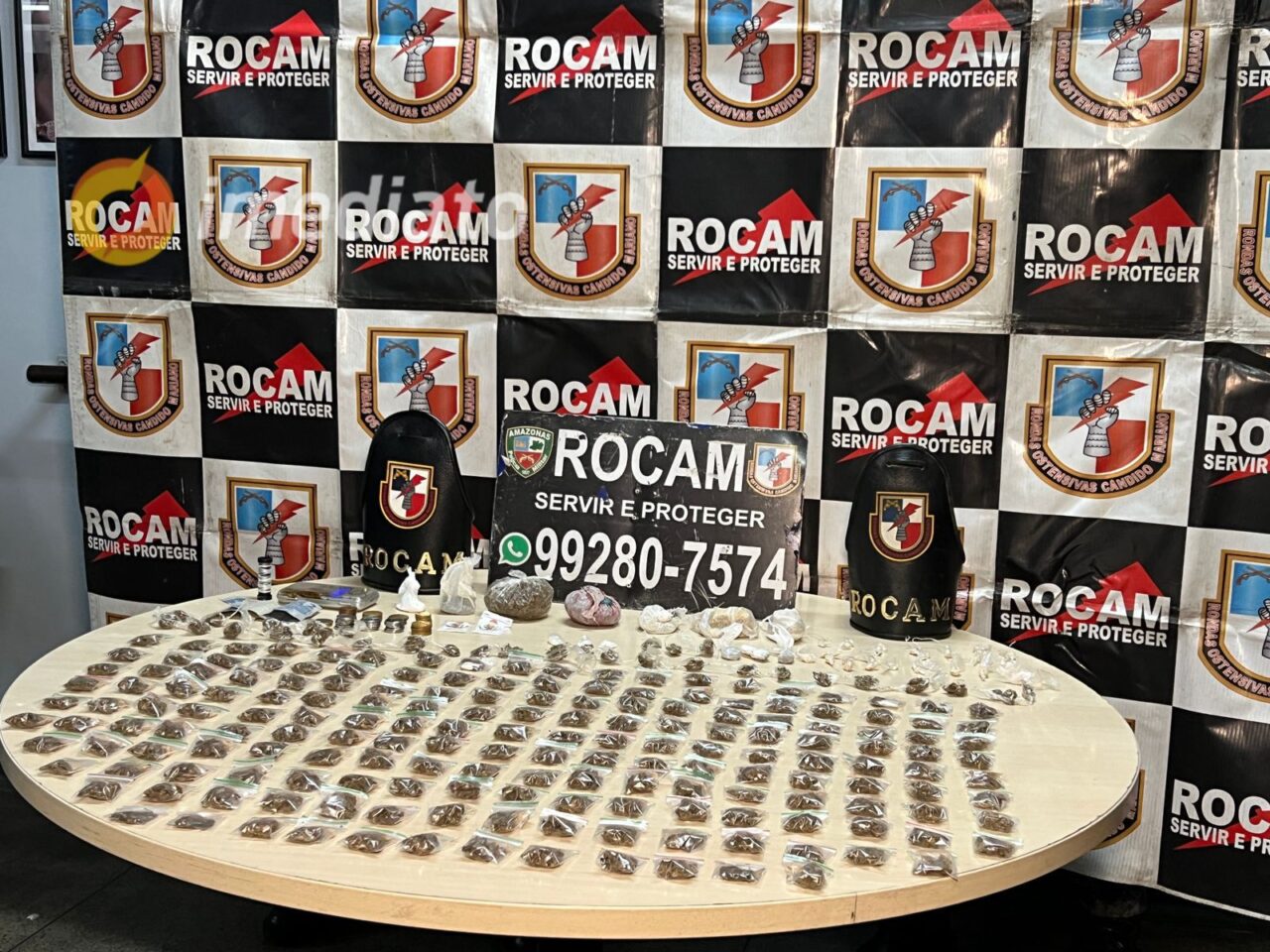 MANAUS-AM | Na noite desta quarta-feira (4), uma operação da Rondas Ostensivas Cândido Mariano (ROCAM) resultou na apreensão de uma grande quantidade de drogas na Rua Terreiro Aranha, localizada no Centro de Manaus. A ação foi desencadeada após uma denúncia anônima que alertou as autoridades sobre atividades suspeitas na região, conhecida por ser um ponto de intenso movimento de tráfico de entorpecentes.