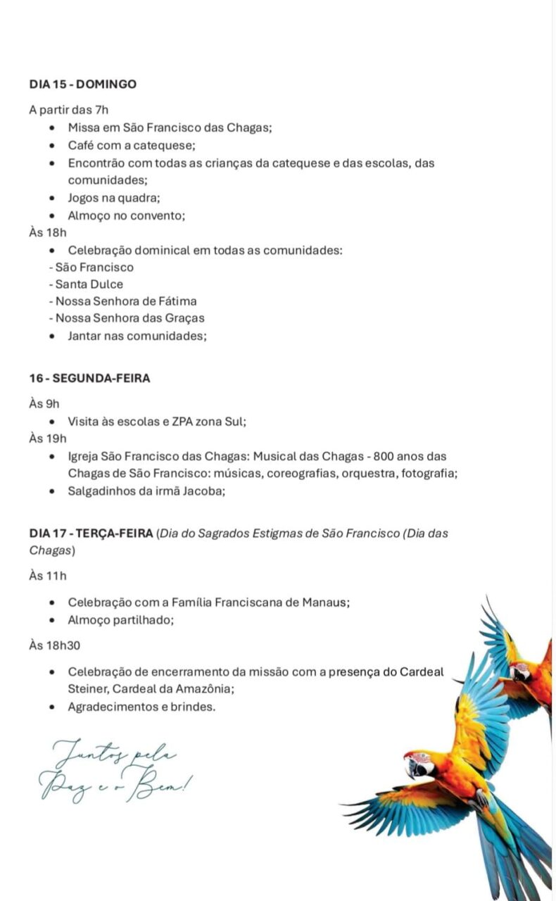 De acordo com Frei Paulo Xavier, pároco da Paróquia São Francisco das Chagas, a presença foi consolidada a partir das diversas iniciativas e sobretudo das Missões Populares: “E as missões se caracterizam onde estão os frades. Já estivemos em São Sebastião, Ouro Verde onde estão os capuchinhos aqui de Manaus e agora nós vamos realizar, de 8 até 17 de setembro, na Paróquia São Francisco das Chagas, no Colônia Oliveira Machado. Esse ano também celebra 800 anos das ‘Chagas de São Francisco. É uma iniciativa bonita para estarmos presentes na vida do povo, nas comunidades, nas famílias, visitando, abençoando e fortalecendo a fé. É o jeito franciscano de ser na missão popular que acolhe a partir de toda essa realidade dos capuchinhos e presença nos dois estados como também na vida do povo refletindo essa dimensão tão importante na vida de São Francisco. E no dia 17 nós encerraremos no dia em que nós celebramos as ‘Chagas’ de São Francisco, os ‘Estigmas’, uma bonita experiência de podermos viver a nossa fé. E que São Francisco nos abençoe e fortaleça a nossa fé e nos encoraje para irmos ao encontro das realidades concretas do nosso povo e sobretudo reconhecendo que existem muitas ‘Chagas’ abertas que precisam ser cicatrizadas, muitas feridas ainda sangrando que precisam ser amenizadas a partir da solidariedade e do compromisso com a vida, com a justiça, com a paz, com a fraternidade e com o amor. Que esse tempo nos ajude a reverenciarmos toda a criação e que São Francisco no abençoe nessa caminhada e missão”, concluiu Frei Paulo Xavier.