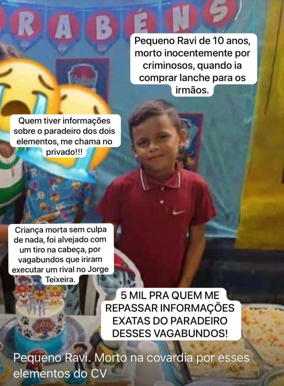 Um menino de 11 anos identificado como, Gabriel Ravi, foi morto com um tiro na cabeça na noite deste sábado (7), enquanto saía de casa para comprar um lanche na rua Perpétua, no bairro Valparaíso, zona leste de Manaus. A criança foi atingida durante um tiroteio envolvendo membros de facções criminosas que disputam o controle do tráfico na região.