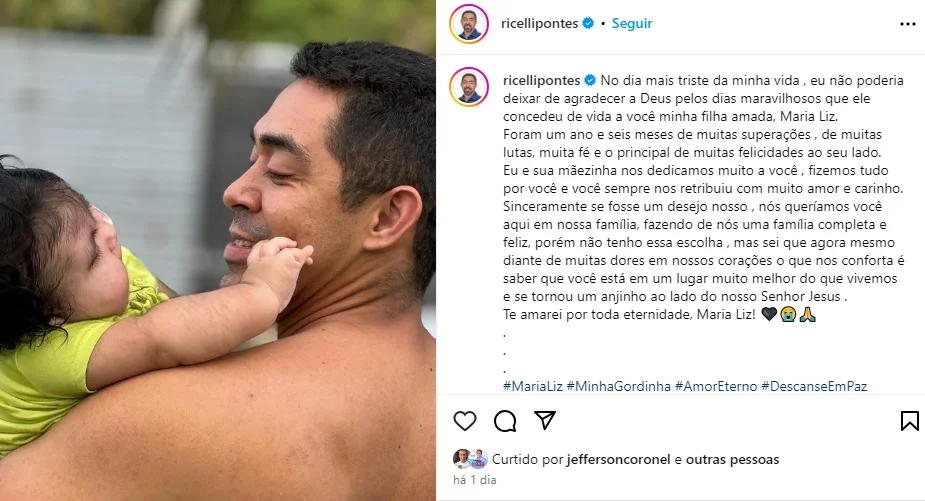 A dor da perda foi amplamente compartilhada nas redes sociais, especialmente após uma comovente publicação de Ricelli Pontes no Instagram. O vice-prefeito, em um relato sincero e tocante, expressou sua gratidão a Deus pelos momentos que viveu com sua filha. “No dia mais triste da minha vida, eu não poderia deixar de agradecer a Deus pelos dias maravilhosos que ele concedeu de vida a você, minha filha amada, Maria Liz. Foram um ano e seis meses de muitas superações, de muitas lutas, muita fé e o principal, de muitas felicidades ao seu lado”, escreveu Ricelli, refletindo sobre a experiência e a felicidade proporcionadas pela filha.
